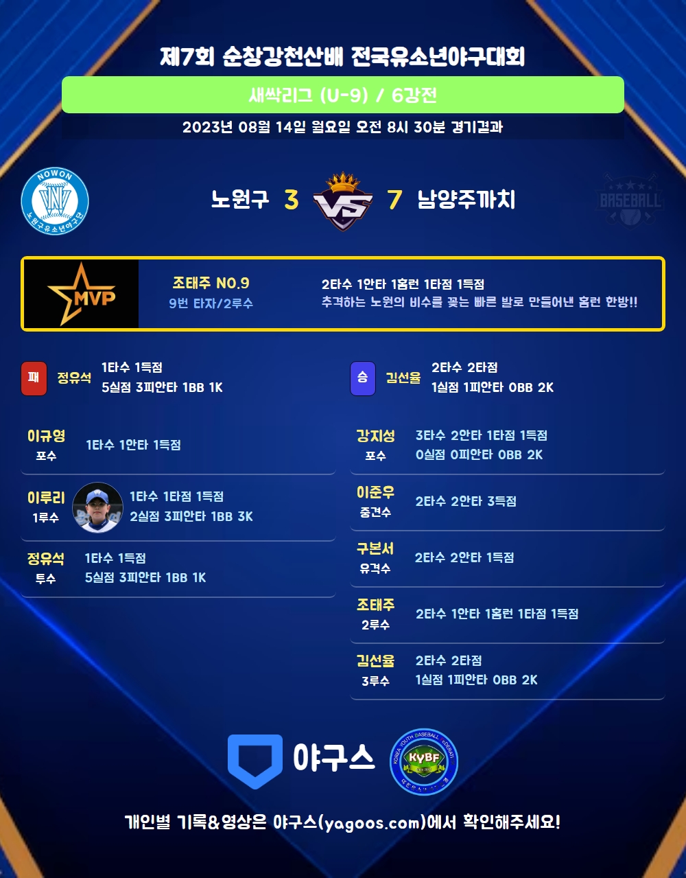 | 9 | 二 | 조태주(9) | 투땅 | - | 중G홈런 | 2 | 1 | 1 | 1 | 1 | 0 | - | 0 | 0.500 |