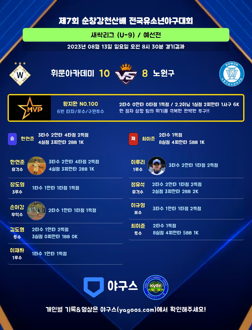 | 휘문아카데미 | 8 | 0 | 0 | 2 | 10 | 7 | 0 | 11 | |