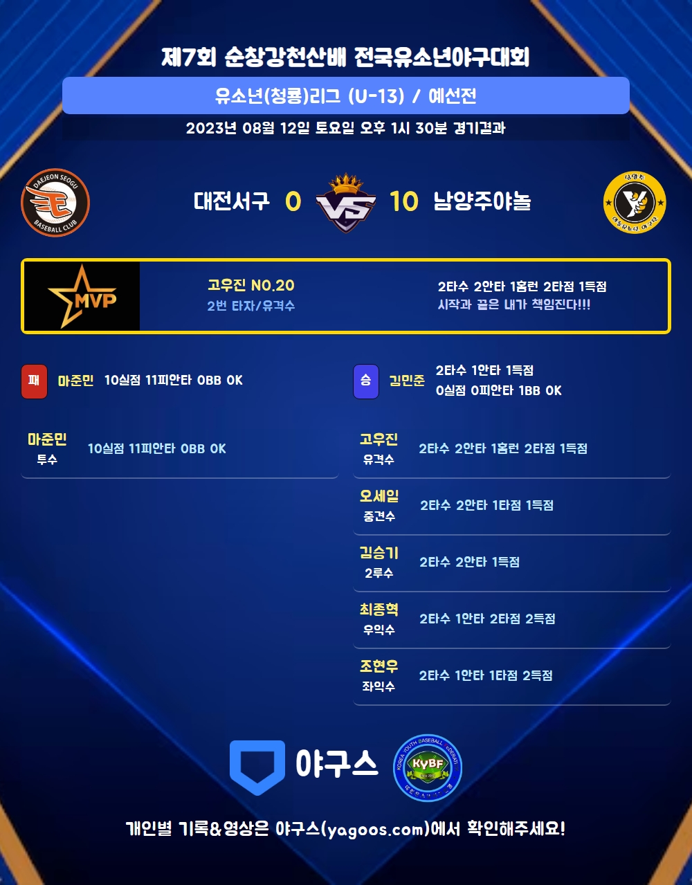 | 1 | 투 | 김민준(2) | 유땅 | 중희플 | 좌중2 | 2 | 1 | 0 | 1 | 0 | 0 | - | 0 | 0.500 |