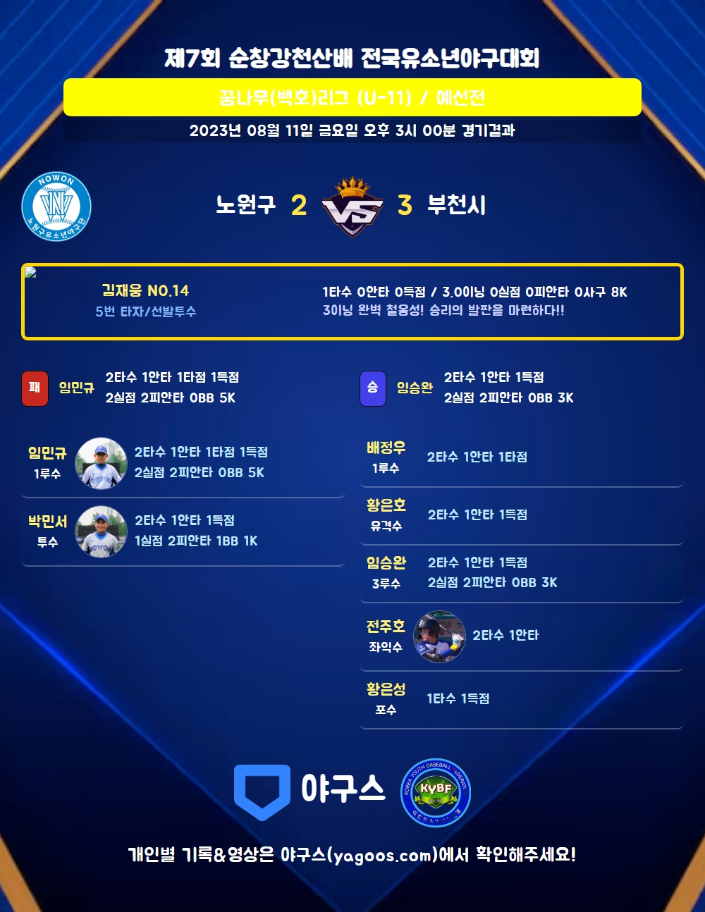 | 3 | 투 | 박민서(13) | 삼진 | - | - | 중월2 | - | 2 | 1 | 0 | 1 | 0 | 0 | - | 1 | 0.500 |