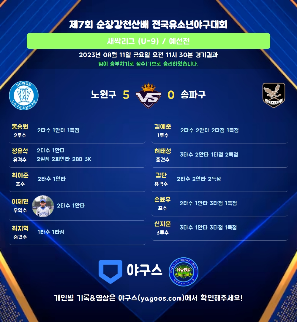 | 5 | 포 | 손윤우(23) | 3실 | 사구 | 중전안 | - | 2 | 1 | 3 | 1 | 0 | 0 | 1 | 0 | 0.500 |