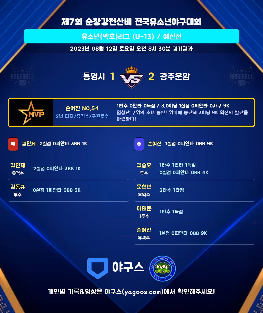 | 6 | 투 | 김승호(12) | - | 유내안 | - | - | 4구 | 1 | 1 | 0 | 1 | 0 | 1 | 1 | 0 | 1.000 |