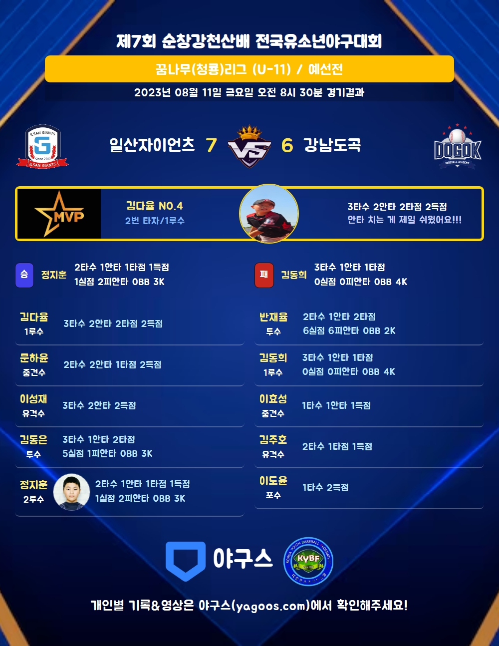 | 일산자이언츠 | 3 | 4 | 0 | 0 | 7 | 8 | 1 | 4 | |