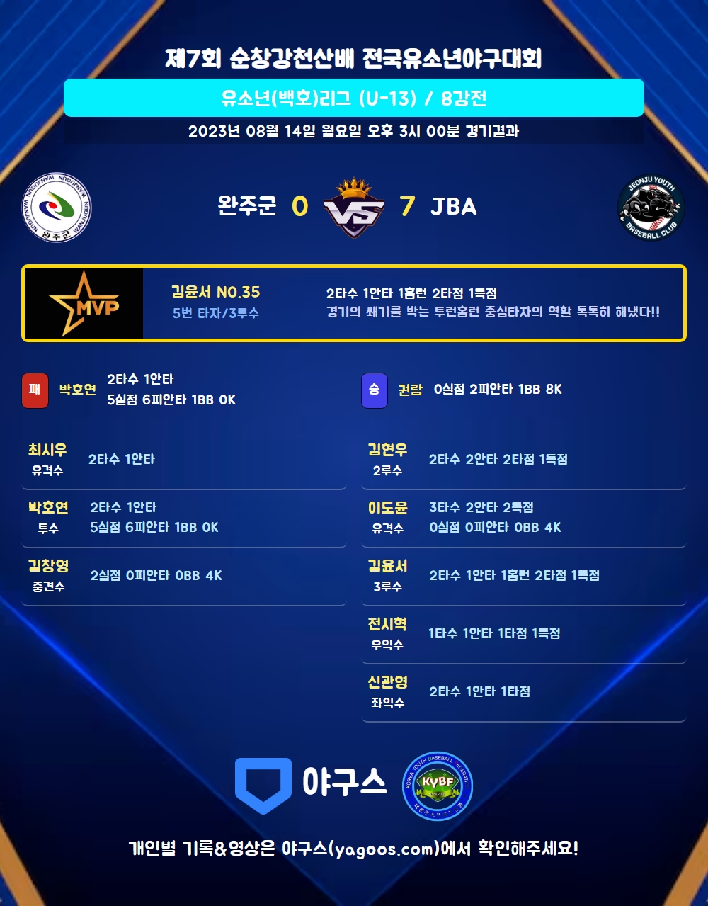 | 4 | 一 | 김동완(23) | 유플 | - | 2실 | - | - | 2 | 0 | 1 | 1 | 0 | 1 | - | 0 | 0.000 |