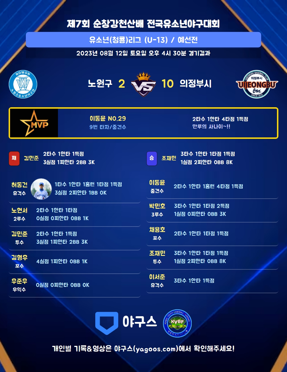 | 1 | 투 | 김민준(1) | 삼진 | - | 유내안 | - | 2 | 1 | 0 | 1 | 0 | 0 | - | 1 | 0.500 |