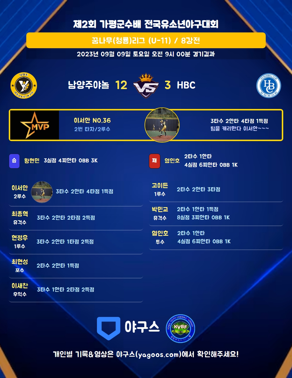 | 남양주야놀 | 1 | 3 | 0 | 8 | 12 | 9 | 0 | 7 | |
