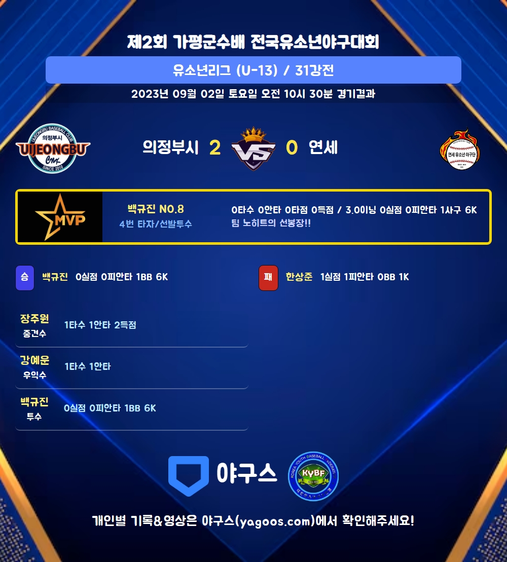 | 1 | 백규진(8) | 승 | - | 12 | 0 | 0 | 0 | 3 | 6 | 49 | 0 | 0 | 0 |