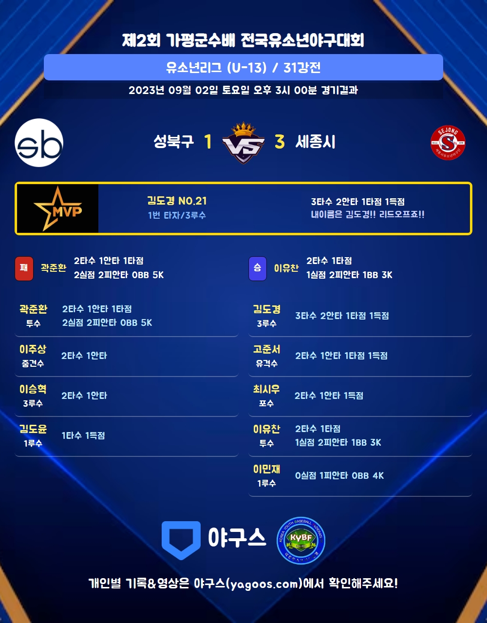 | 1 | 三 | 김도경(21) | 좌전안 | - | 유플 | - | 중전안 | 3 | 2 | 1 | 1 | 0 | 2 | - | 0 | 0.667 |