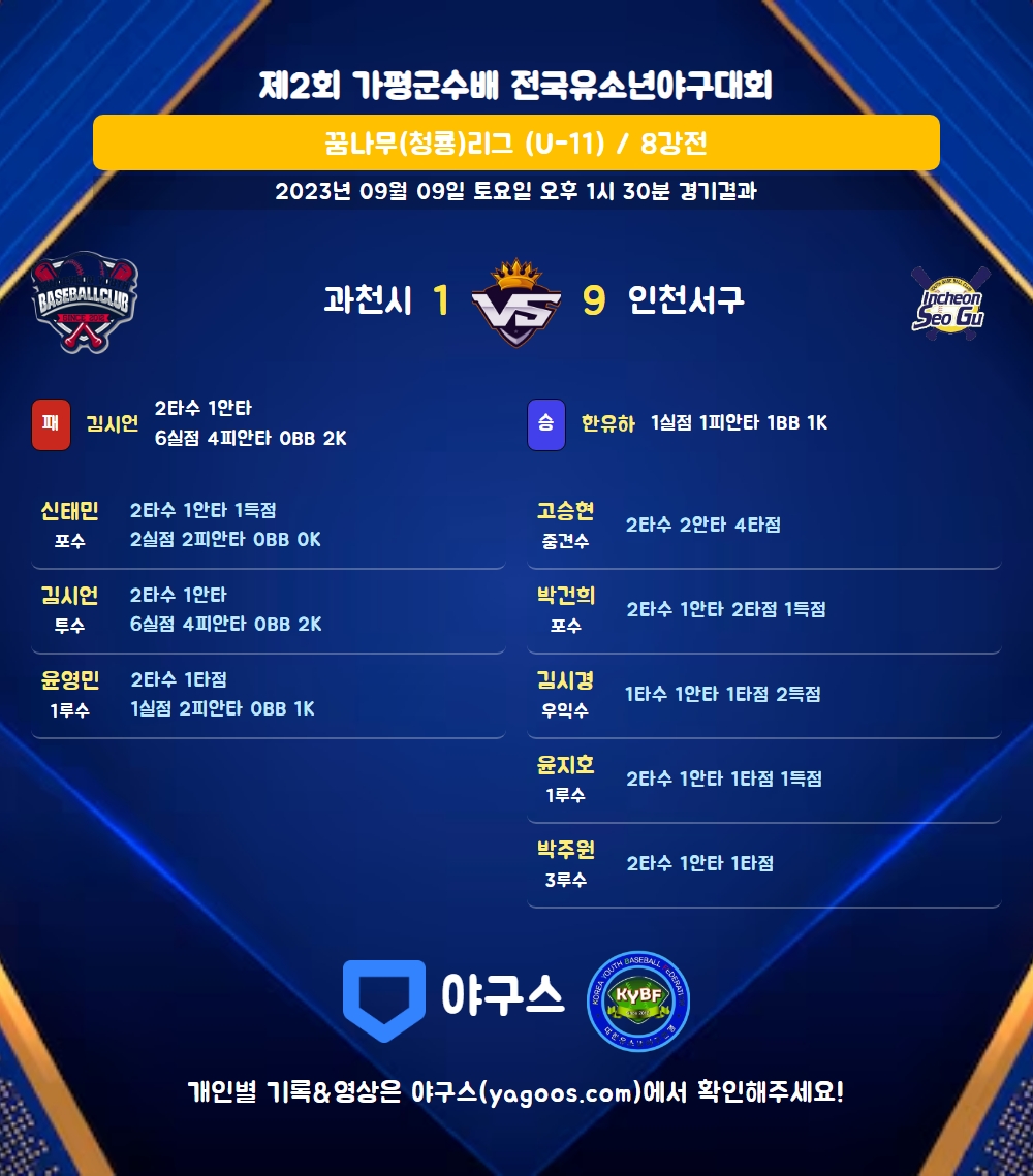 | 5 | 一 | 윤지호(10) | - | 투땅 | 좌전안 | 4구 | 2 | 1 | 1 | 1 | 0 | 1 | 1 | 0 | 0.500 |