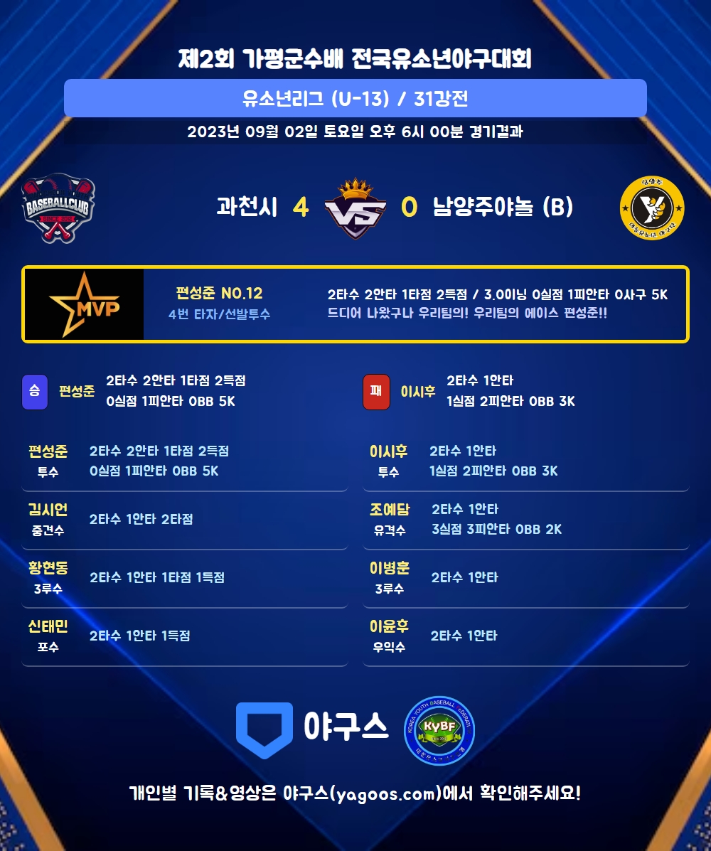 | 4 | 투 | 편성준(12) | - | 투내안 | - | 중전2 | - | - | 2 | 2 | 1 | 2 | 0 | 0 | - | 0 | 1.000 |