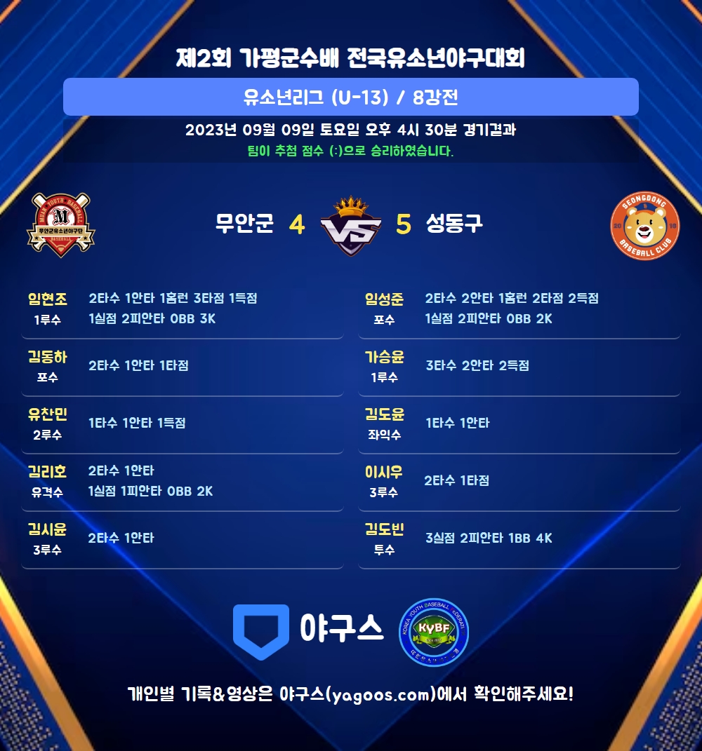 | 6 | 포 | 김동하(10) | - | 투땅병 | - | 우전안 | 2 | 1 | 1 | 0 | 0 | 1 | - | 0 | 0.500 |
