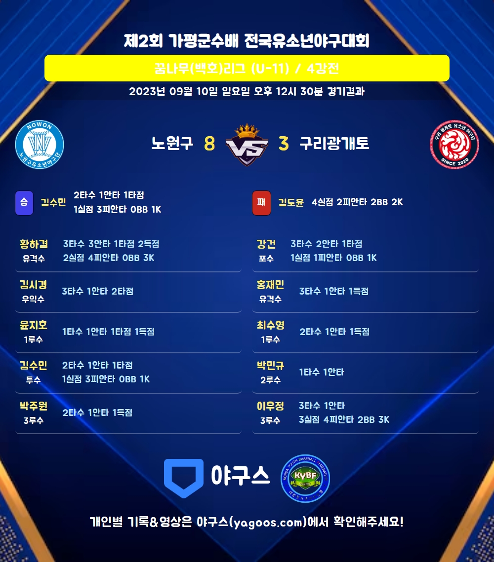 | 1 | 김도윤(13) | 패 | - | 9 | 2 | 2 | 0 | 5 | 2 | 43 | 4 | 4 | 0 |