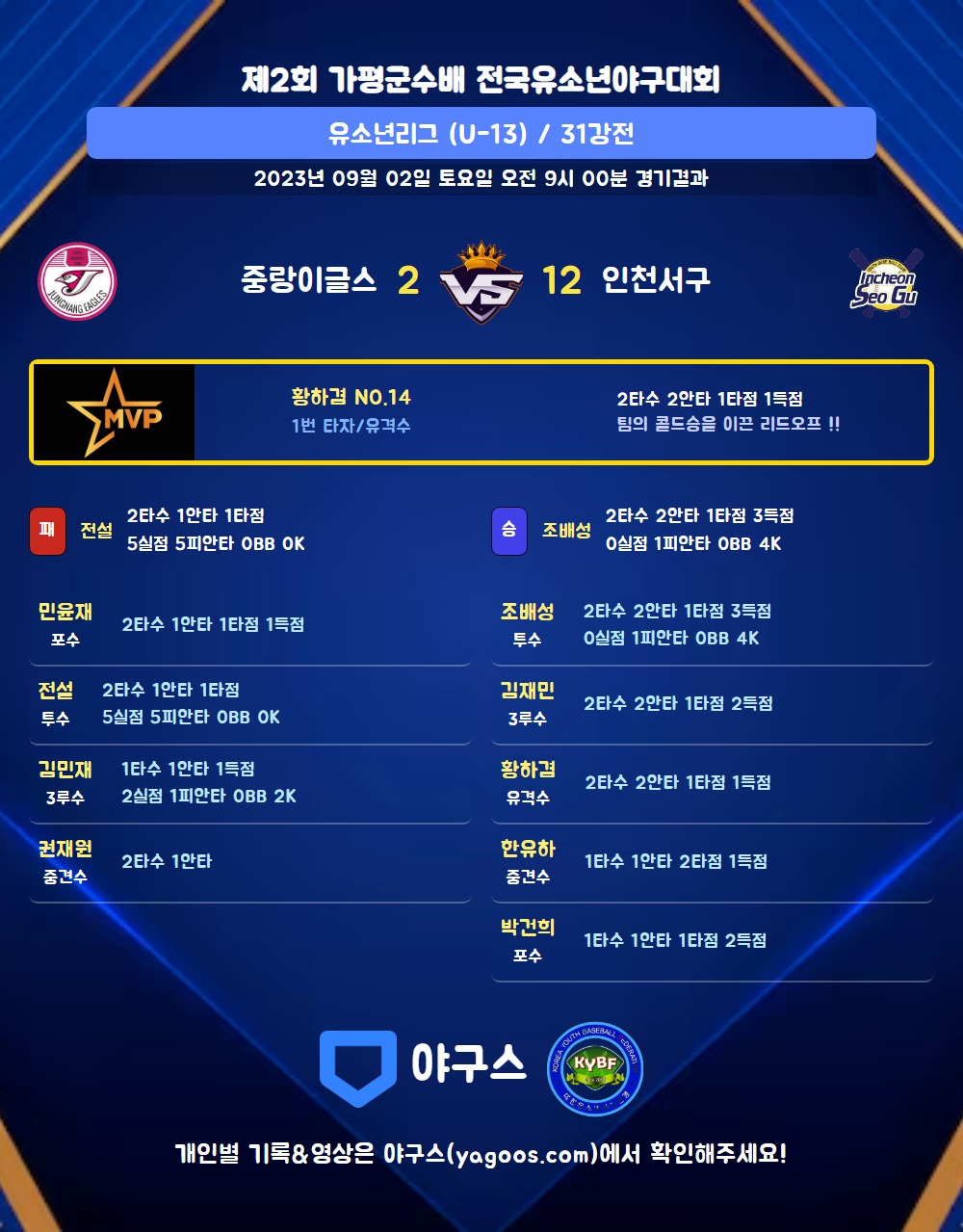 | 1 | 유 | 이민준(8) | 삼진 | 삼진 | - | 2 | 0 | 0 | 0 | 0 | 0 | - | 2 | 0.000 |
