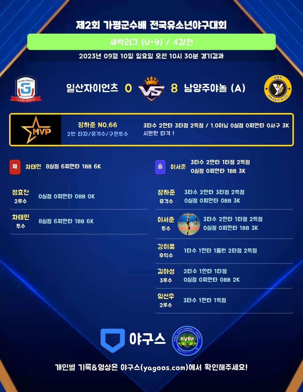 | 일산자이언츠 | 0 | 0 | 0 | 0 | 0 | 0 | 0 | 1 | 2 | |