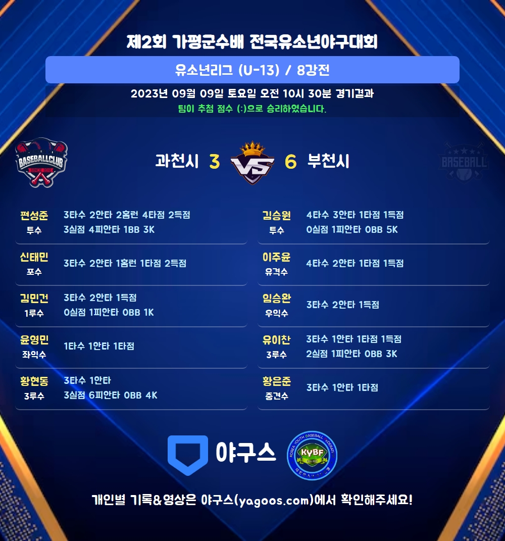 | 팀명 | 1회 | 2회 | 3회 | 4회 | 5회 | 6회 | R | H | E | B | L |