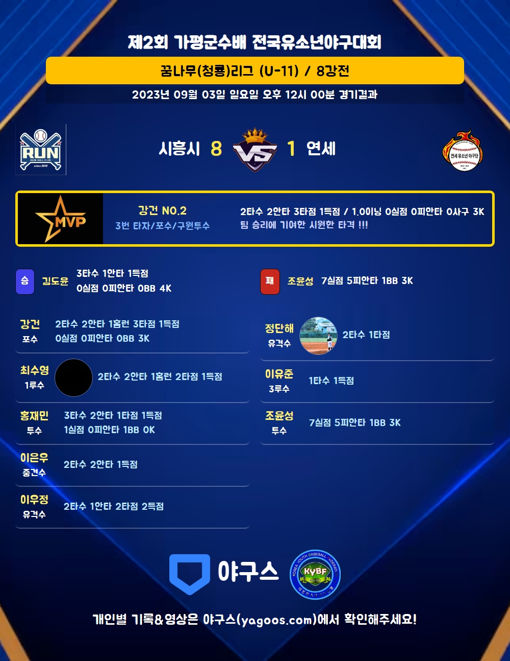 | 1 | 투 | 홍재민(5) | 좌전안 | 2내안 | 3직 | - | - | 3 | 2 | 1 | 1 | 0 | 2 | - | 0 | 0.667 |