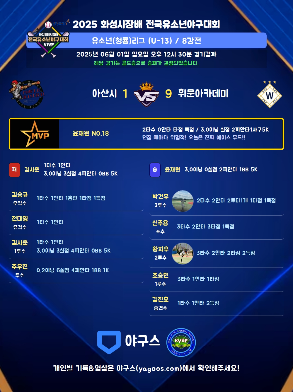 | 2 | 윤재원(18) | 승 | 3.0 | 10 | 9 | 2 | - | 1 | 5 | 46 | - | - | 0 |