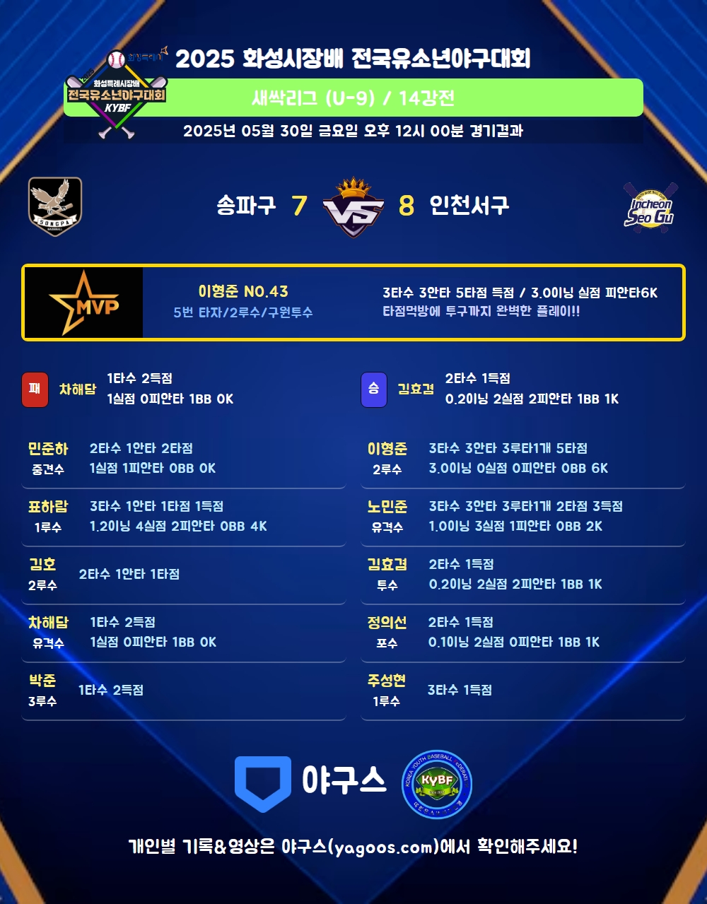 | 5 | 二 | 이형준(43) | - | 투내안(1타점) | 좌월3(2타점) | 2내안(2타점) | - | 3 | 3 | 5 | - | - | - | - | - | 1.000 |