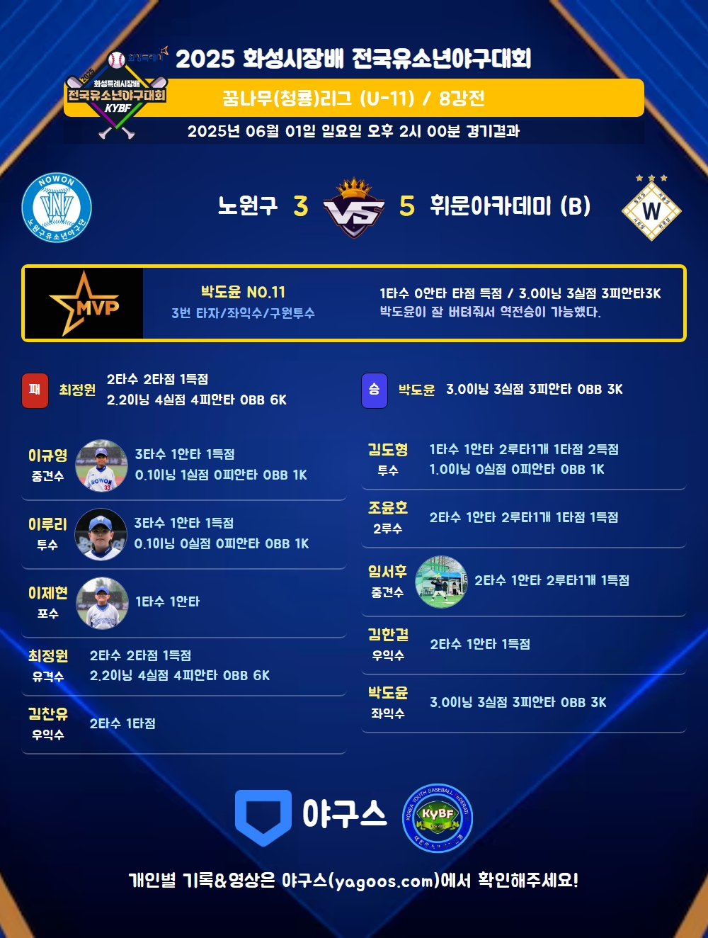 | 1 | 박도윤(11) | 승 | 3.0 | 16 | 14 | 3 | - | 2 | 3 | 59 | 3 | 3 | 9.00 |