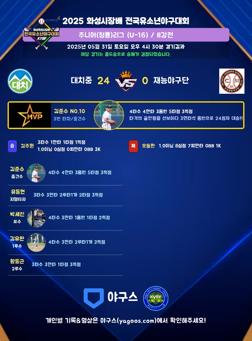 | 홈런 | 한민(6) 김준수(10) 박세진(26) 이지오(52) |