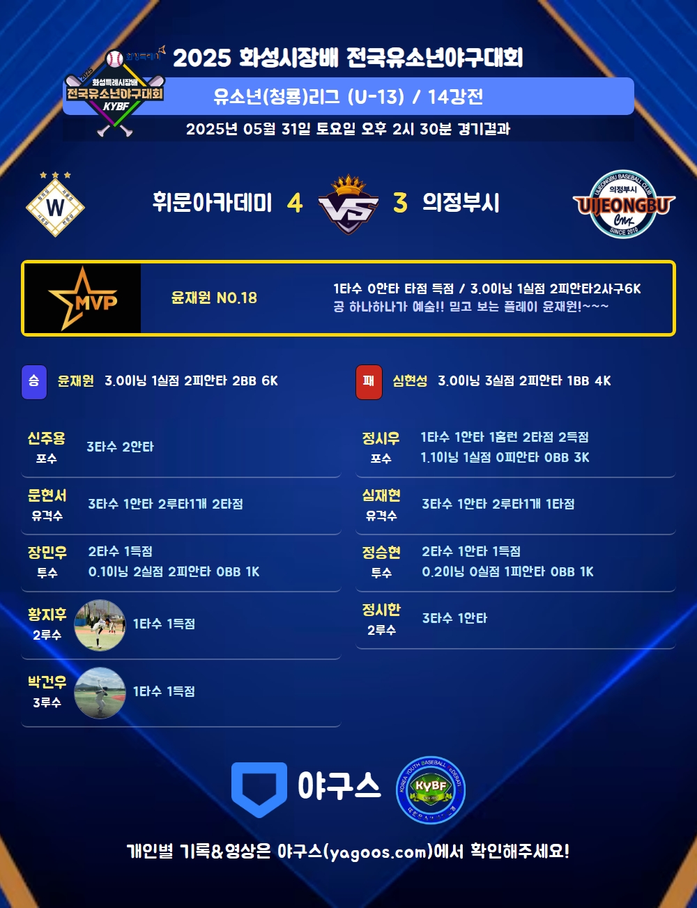 | 3 | 유 | 문현서(1) | 투땅 | - | 우선2(2타점) | - | 2플 | - | 3 | 1 | 2 | - | - | - | - | - | 0.333 |
