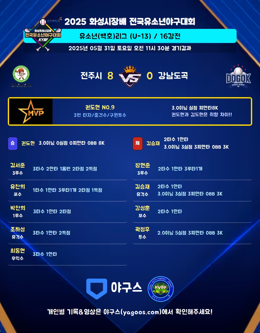 | 1 | 권도현(9) | 승 | 3.0 | 9 | 8 | - | - | 1 | 8 | 41 | - | - | 0 |