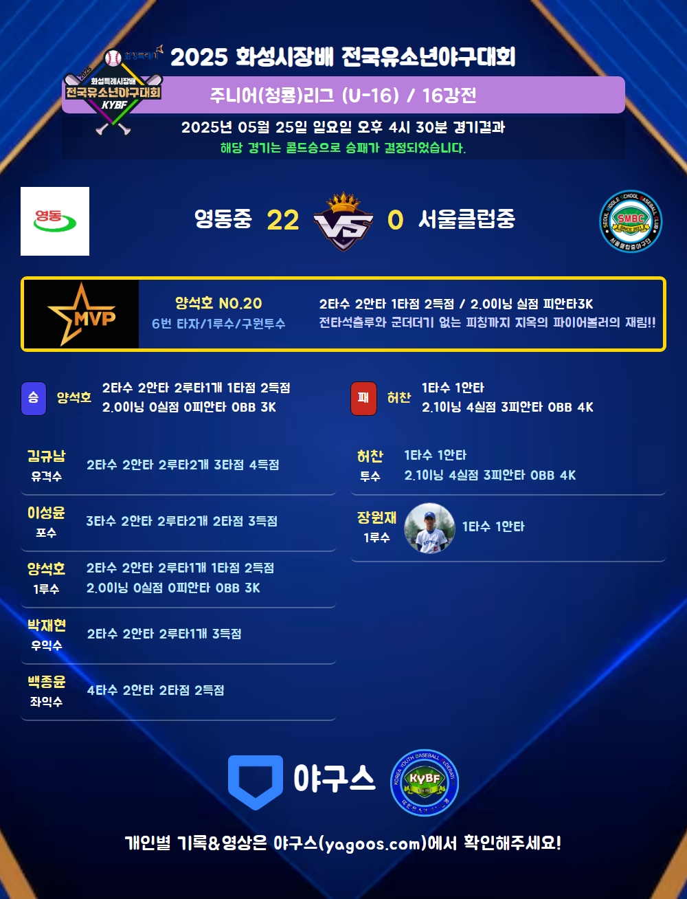 | 2루타 | 박재현(1) 이성윤(22) 김규남(7) 양석호(20) 정승우(6) 임하율(37) 김태윤(23) 신태민(30) |