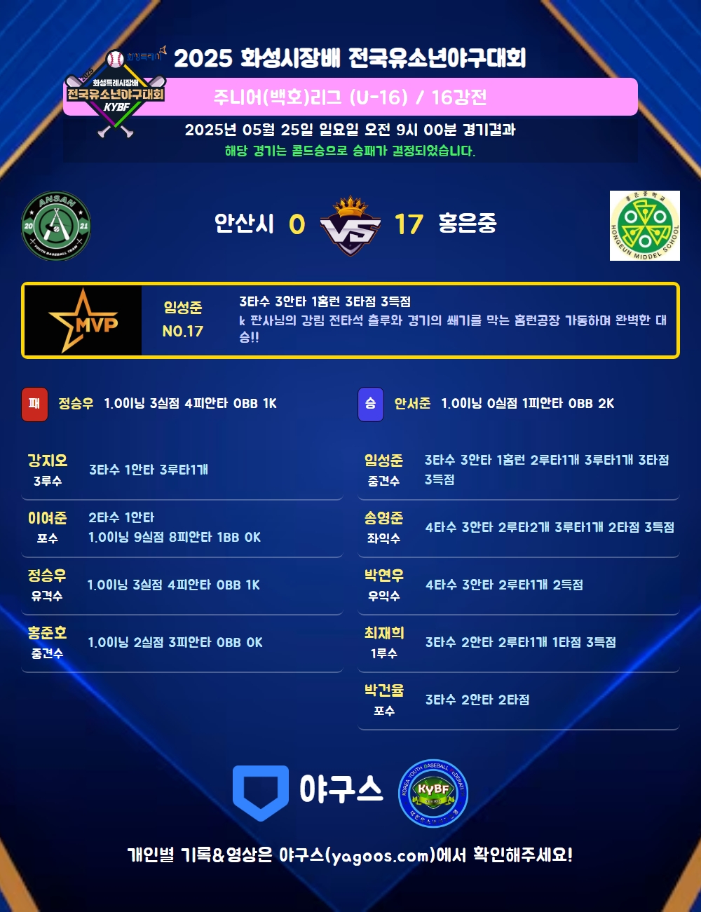| 5 | 중 | 임성준(17) | 중월3(1타점) | 좌중2(1타점) | 좌월홈(1타점) | 사구 | - | - | - | 3 | 3 | 3 | 3 | 1 | 1 | 1 | - | 1.000 |