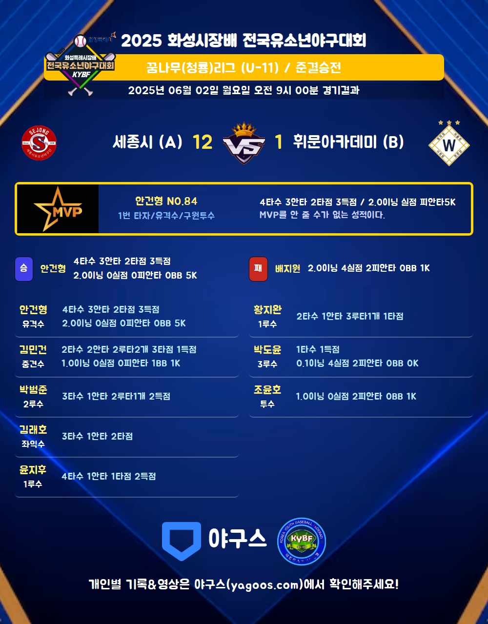 | 2 | 一 | 윤지후(3) | 유땅 | 유땅 | 중안(1타점) | 2야선 | - | 4 | 1 | 1 | 2 | - | - | - | - | 0.250 |