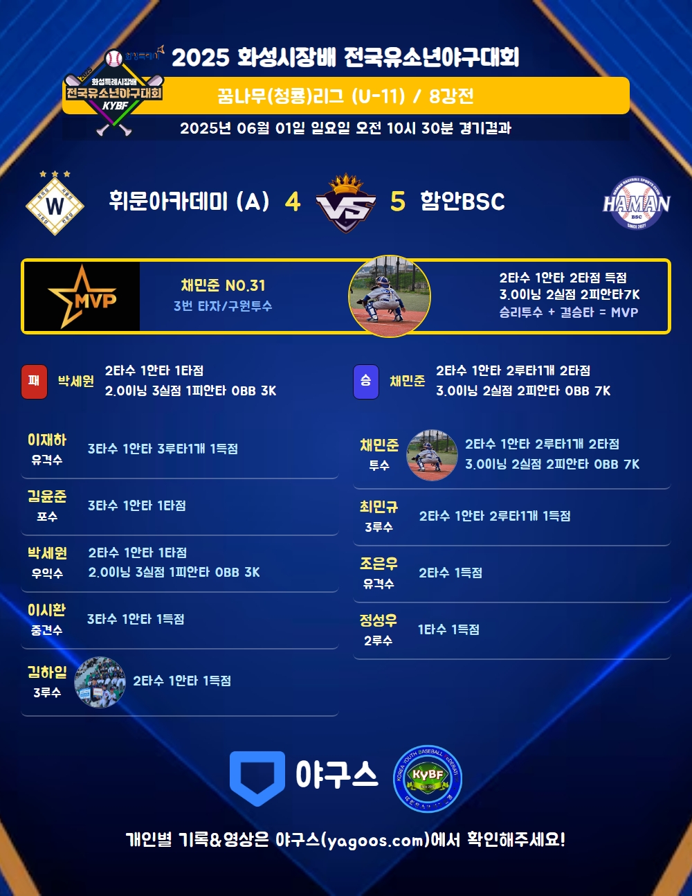 | 3 | 투 | 채민준(31) | 2땅 | - | 좌중2(2타점) | - | - | 2 | 1 | 2 | - | - | - | - | - | 0.500 |