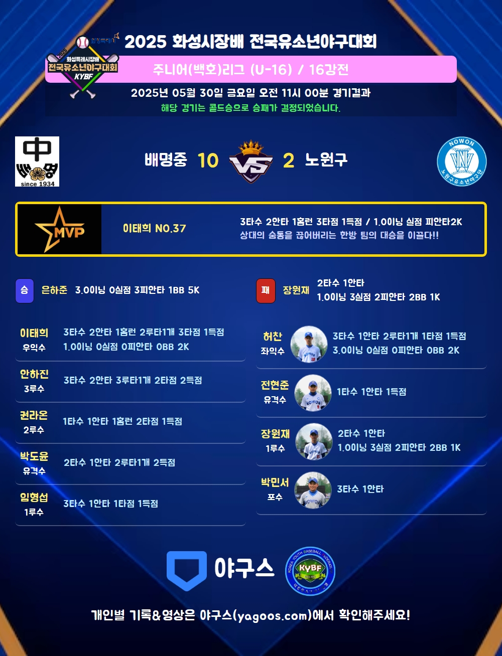 | 2루타 | 박도윤(20) 이태희(37) 허찬(12) |