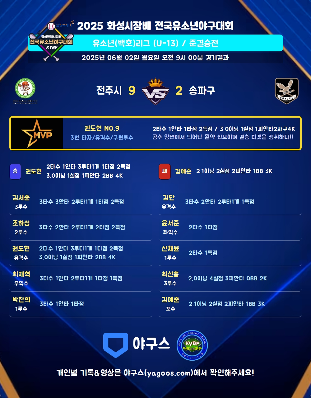 | 2루타 | 조하성(7) 김서준(55) 최재혁(5) 김단(9) |