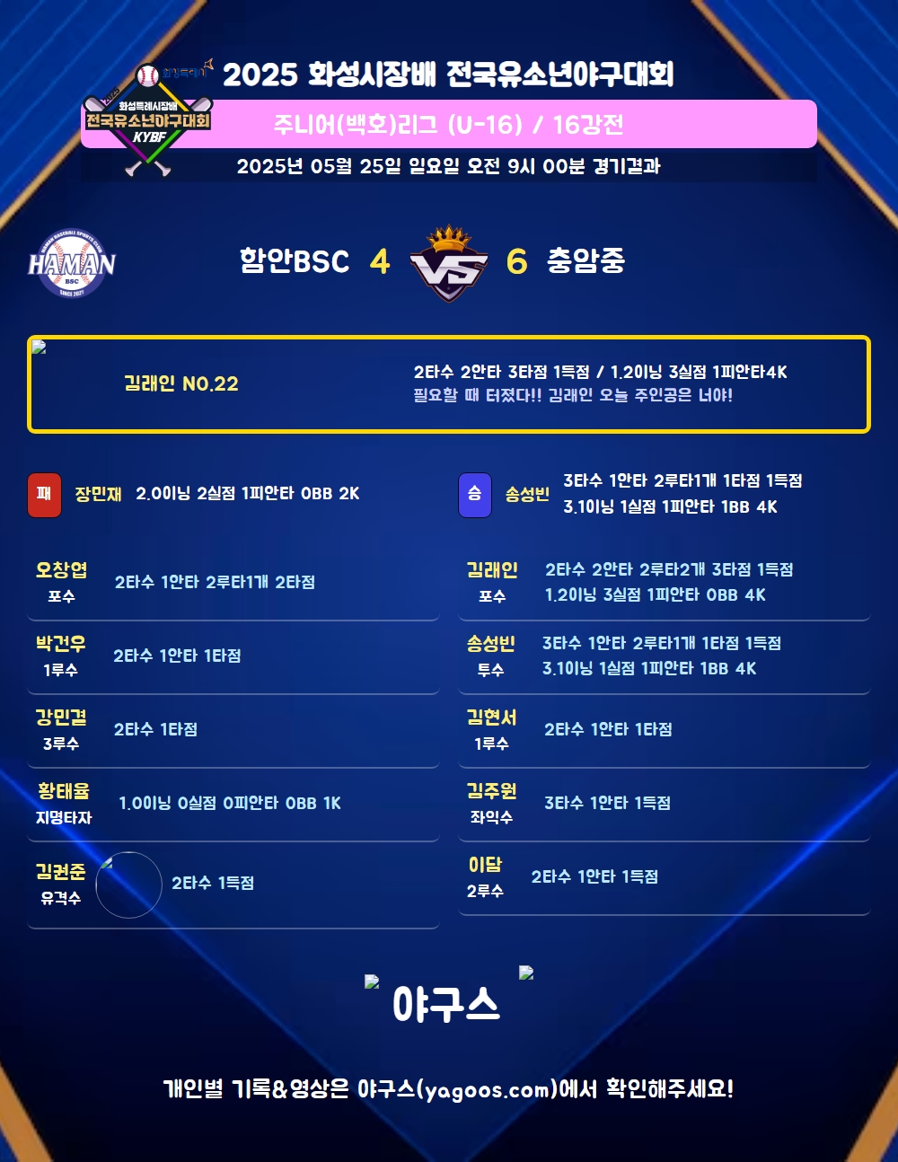 | 2루타 | 오창엽(52) 김래인(22) 송성빈(52) |