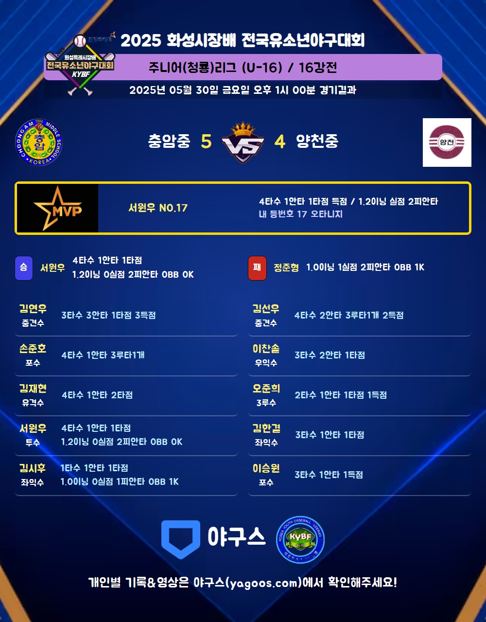 | 6 | 서원우(17) | 승 | 1.2 | 7 | 7 | 2 | - | - | - | 8 | - | - | 0 |