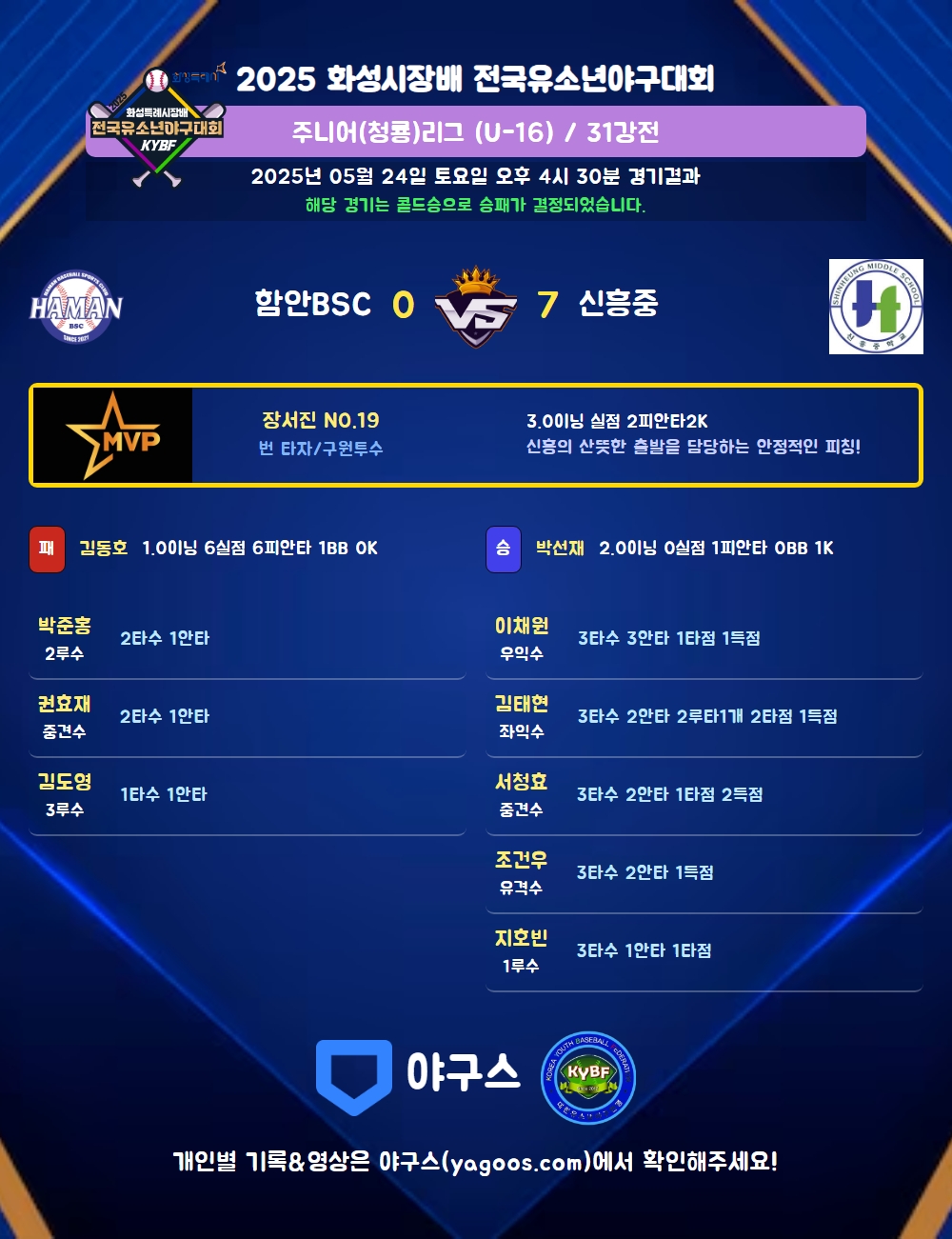 | 3 | 중 | 서청효(9) | 우안(1타점) | 중안 | 삼진 | - | - | - | - | 3 | 2 | 1 | 2 | - | - | - | 1 | 0.667 |
