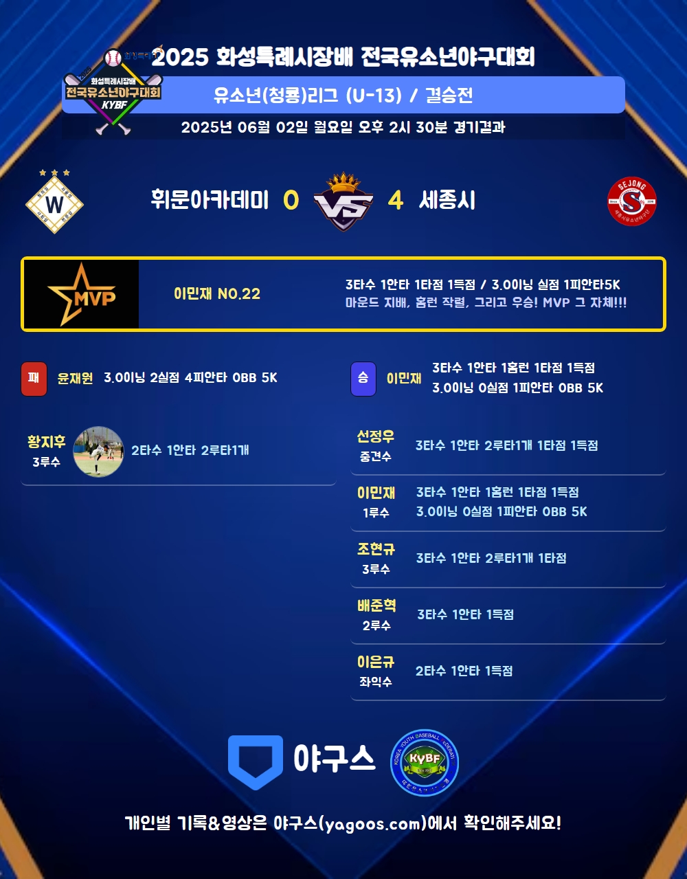 | 4 | 一 | 이민재(22) | 2땅 | - | 1땅 | - | 중월홈(1타점) | - | 3 | 1 | 1 | 1 | 1 | - | - | - | 0.333 |