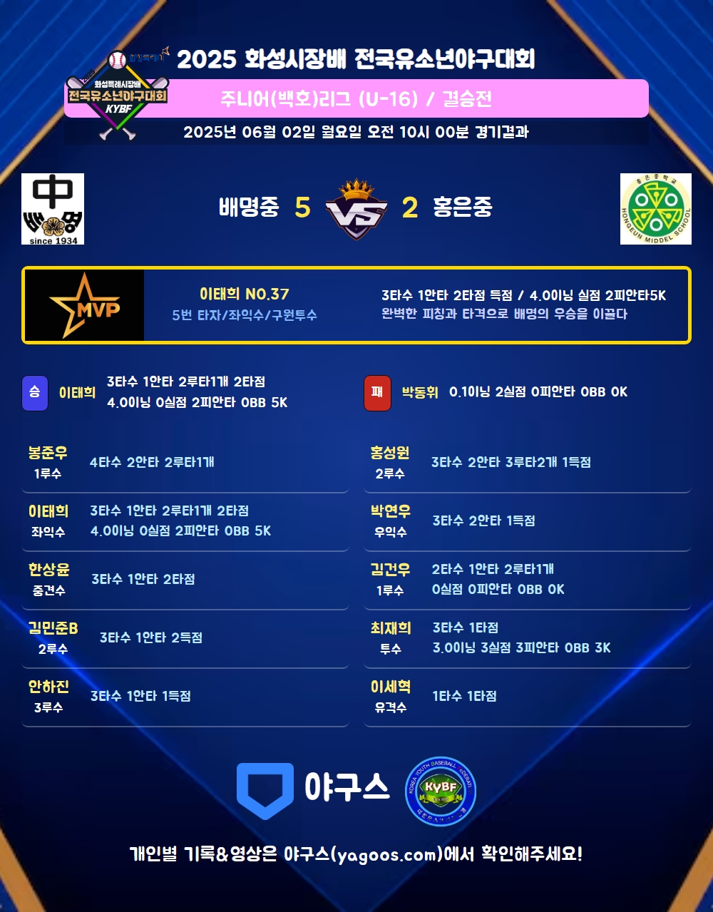 | 2루타 | 봉준우(14) 이태희(37) 김건우(10) |