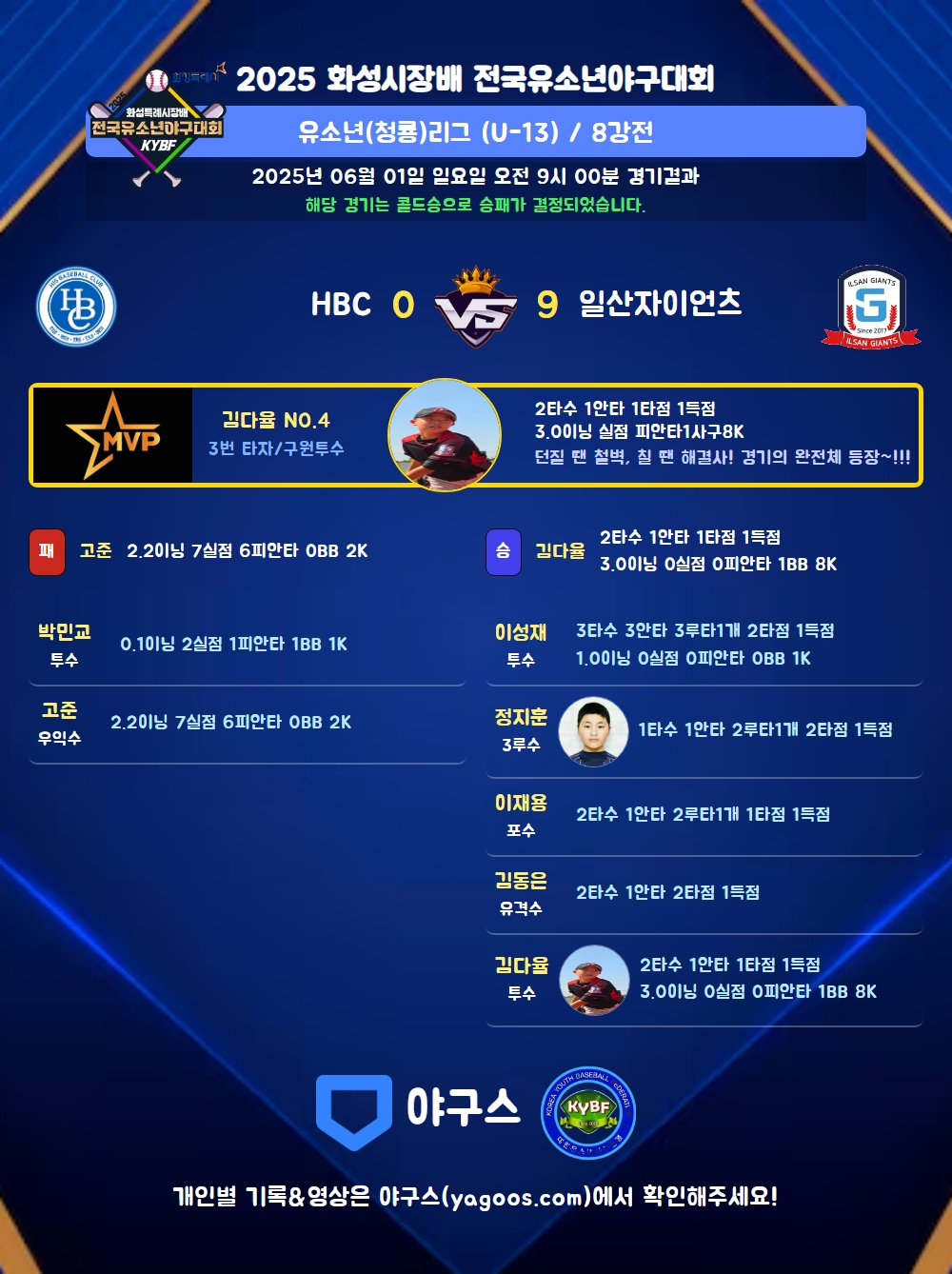 | 일산자이언츠 | 0 | 0 | 9 | 0 | 0 | 0 | 9 | 7 | 0 | 5 | 2 |