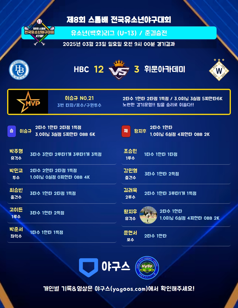 | 7 | 중 | 최승빈(23) | - | 유내안(1타점)/유땅(1타점) | 중플 | - | 3 | 1 | 2 | 1 | - | 2 | - | - | 0.333 |
