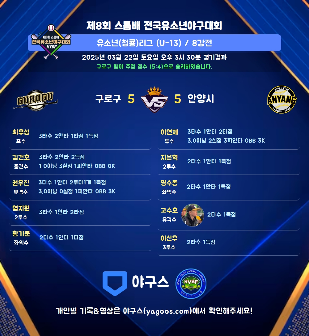 | 8 | 좌 | 황기문(1) | - | 중안(1타점) | - | 2땅 | - | 2 | 1 | 1 | - | - | - | - | - | 0.500 |