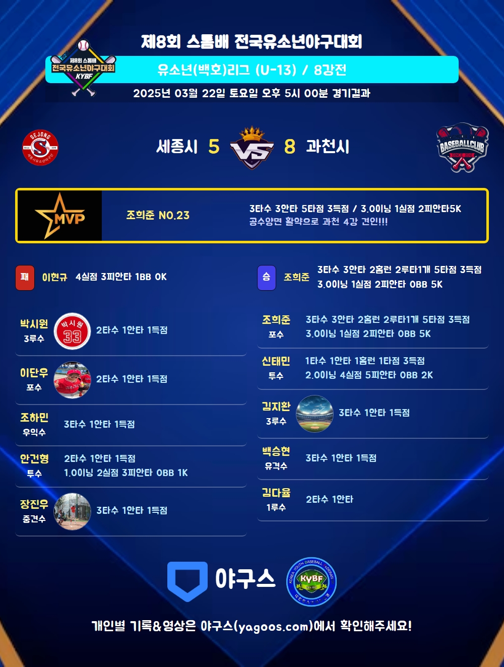 | 4 | 포 | 조희준(23) | 중월2(2타점) | 좌월G홈(2타점) | - | 중월G홈(1타점) | 3 | 3 | 5 | 3 | 2 | - | - | - | 1.000 |