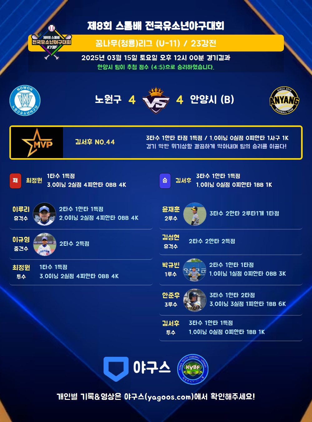 | 1 | 투 | 김서후(44) | 중플 | - | 좌안 | - | 1실 | 3 | 1 | - | 1 | - | - | - | - | 0.333 |