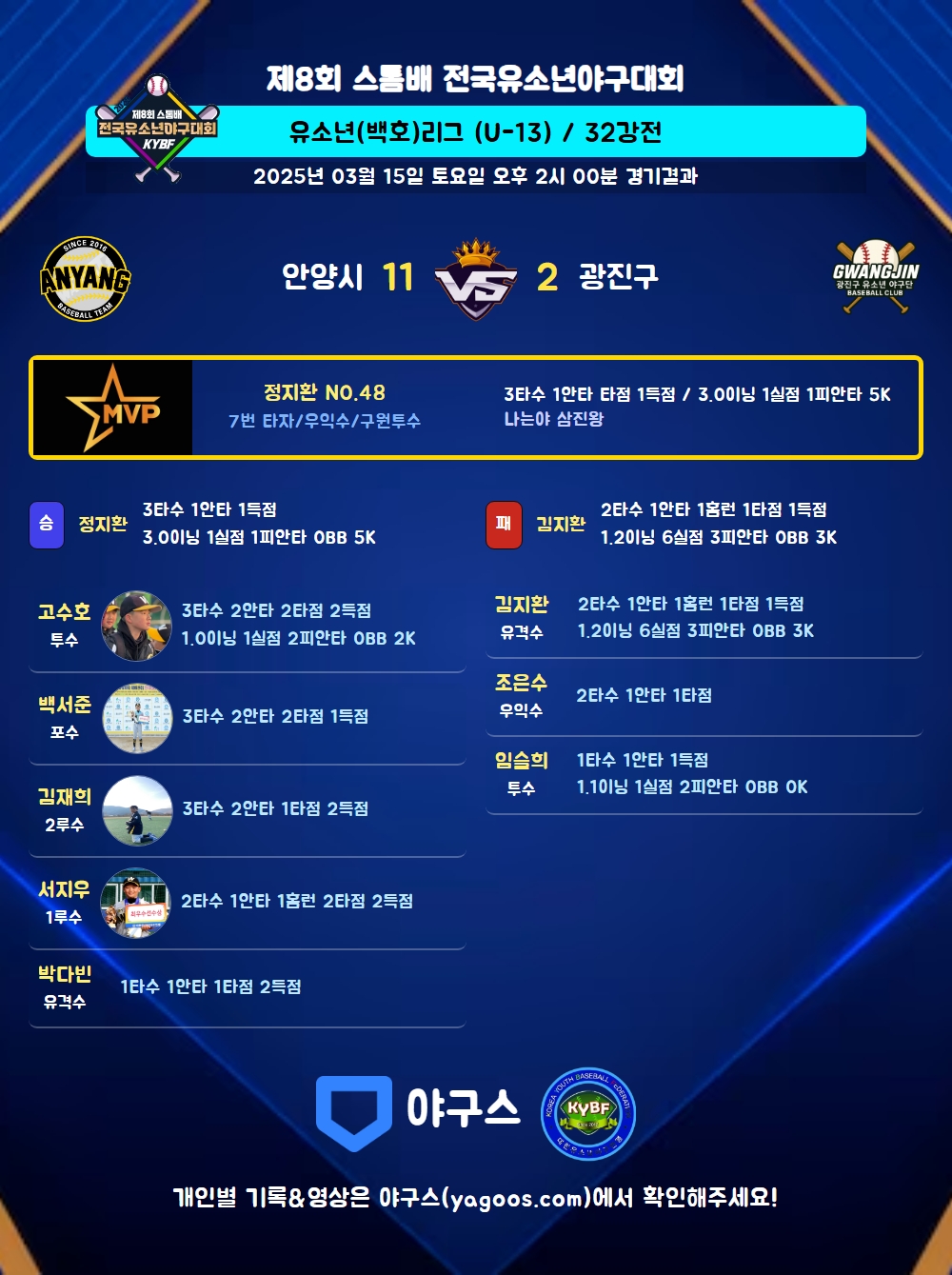 | 1 | 정지환(48) | 승 | 3.0 | 11 | 10 | 1 | 1 | 1 | 5 | 45 | 1 | 1 | 3.00 |