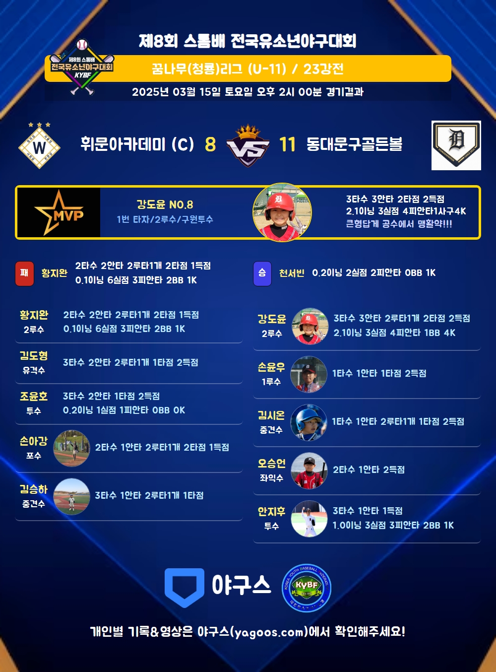 | 1 | 二 | 강도윤(8) | 중안 | 우안(1타점) | 좌선2(1타점) | - | - | - | - | 3 | 3 | 2 | 2 | - | 4 | - | - | 1.000 |