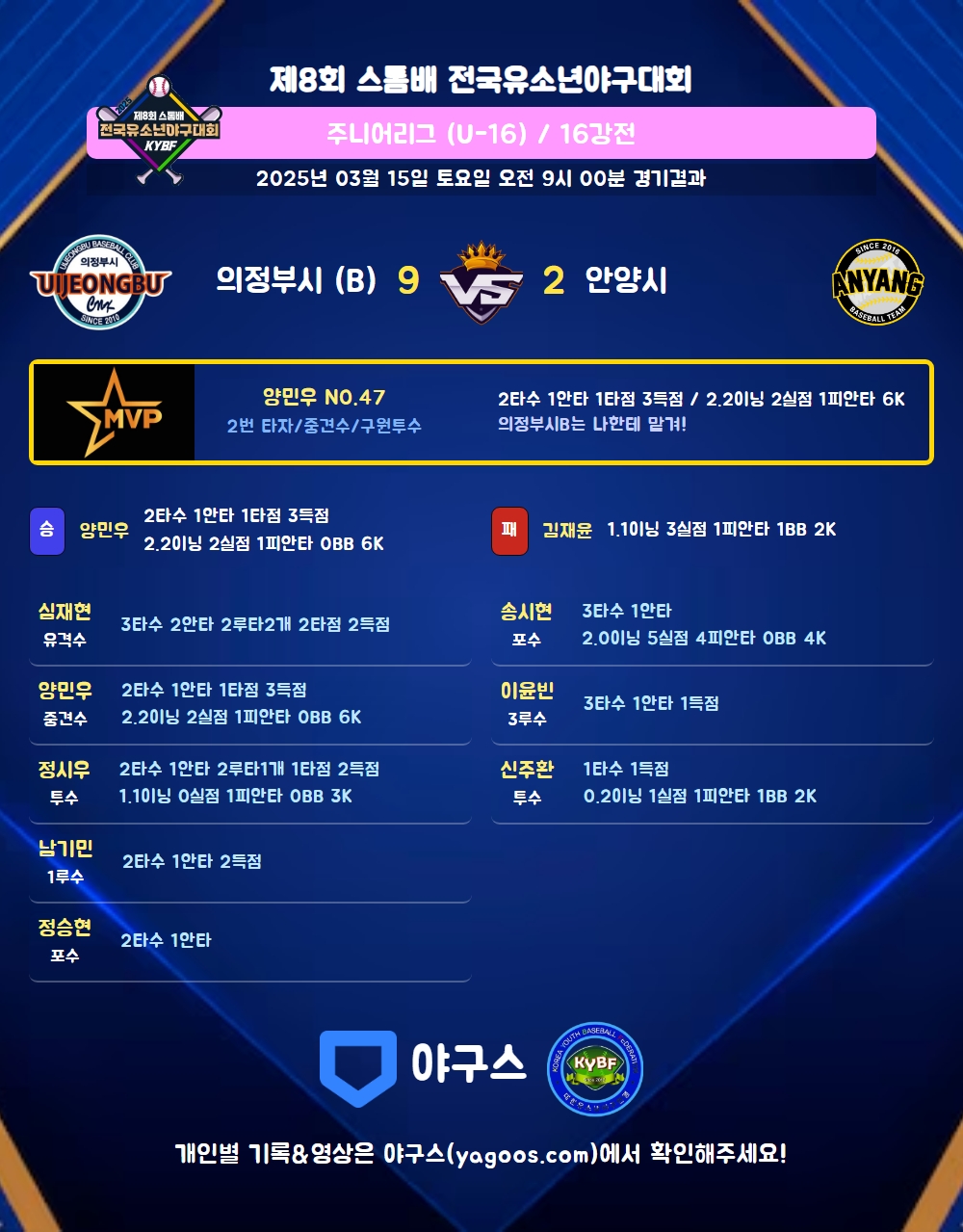 | 2 | 중 | 양민우(47) | 4구 | 3내안(1타점) | - | 3실 | 2 | 1 | 1 | 3 | - | 1 | 1 | - | 0.500 |