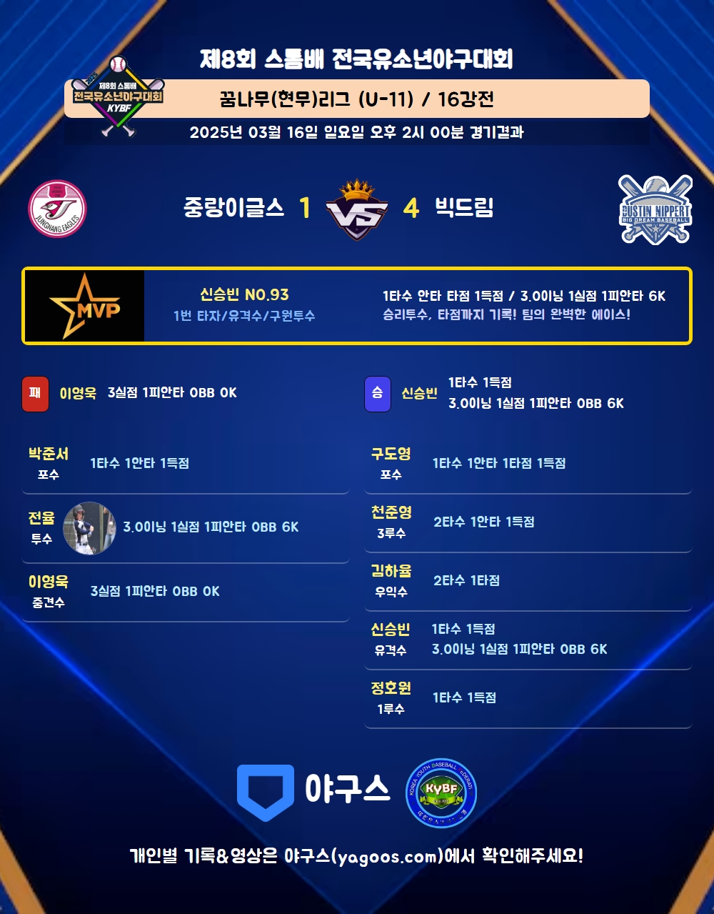 | 1 | 신승빈(93) | 승 | 3.0 | 12 | 10 | 1 | - | 2 | 6 | 49 | 1 | 1 | 3.00 |