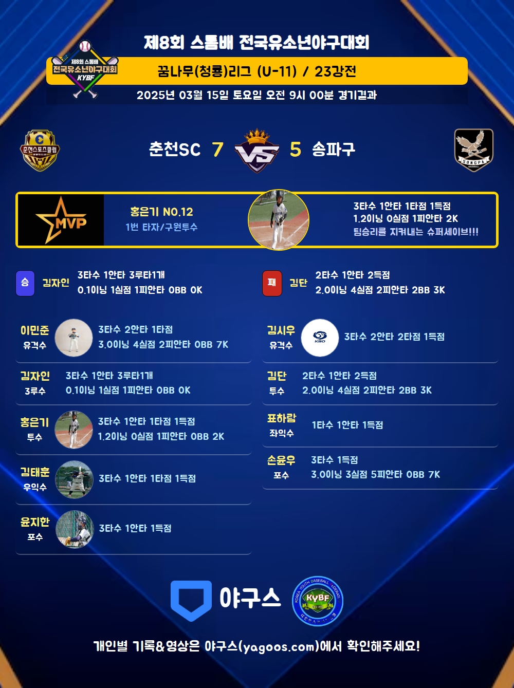 | 1 | 투 | 홍은기(12) | 낫아웃삼진 | 우중안(1타점) | - | 1실 | - | 3 | 1 | 1 | 1 | - | 3 | - | 1 | 0.333 |