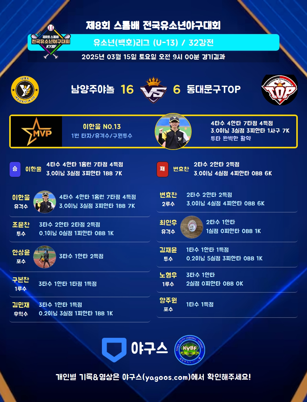 | 1 | 유 | 이한울(13) | 중안 | - | 좌안(1타점) | 좌안(2타점)/중월G홈(4타점) | 4 | 4 | 7 | 4 | 1 | 2 | - | - | 1.000 |