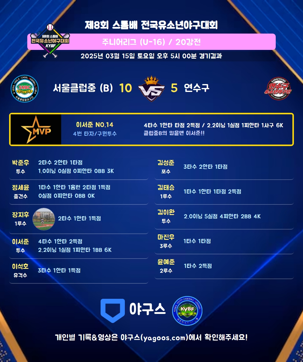 | 5 | 이서준(14) | 승 | 2.2 | 13 | 9 | 1 | - | 3 | 6 | 49 | 1 | 1 | 4.00 |