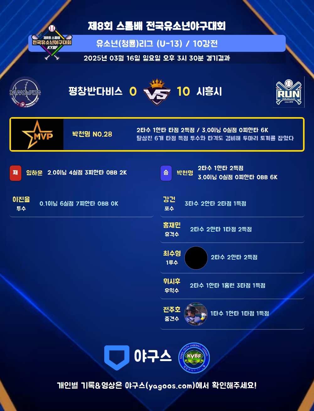 | 1 | 박천명(28) | 승 | 3.0 | 9 | 8 | - | - | 1 | 6 | 38 | - | - | 0.00 |